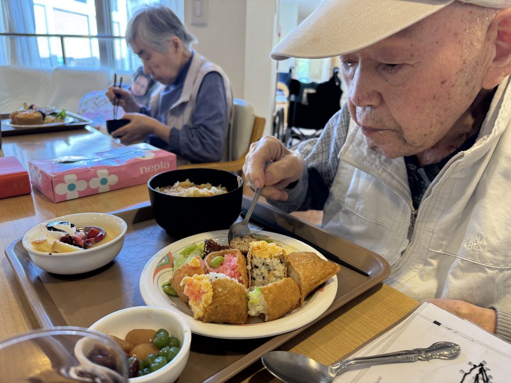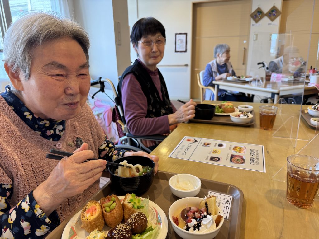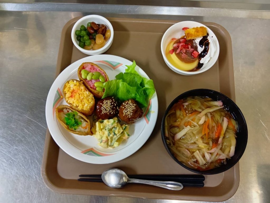 いなり寿司3種・あんかけうどん・手作り肉団子・たまごサラダ・3種のお豆・プリンアラモードの6種類を提供させていただきました。(ちょっと多すぎではないかと施設長ご指摘されていました。。。)