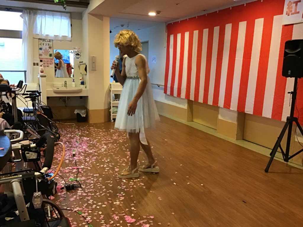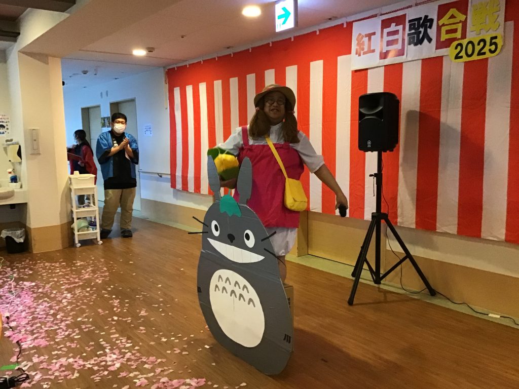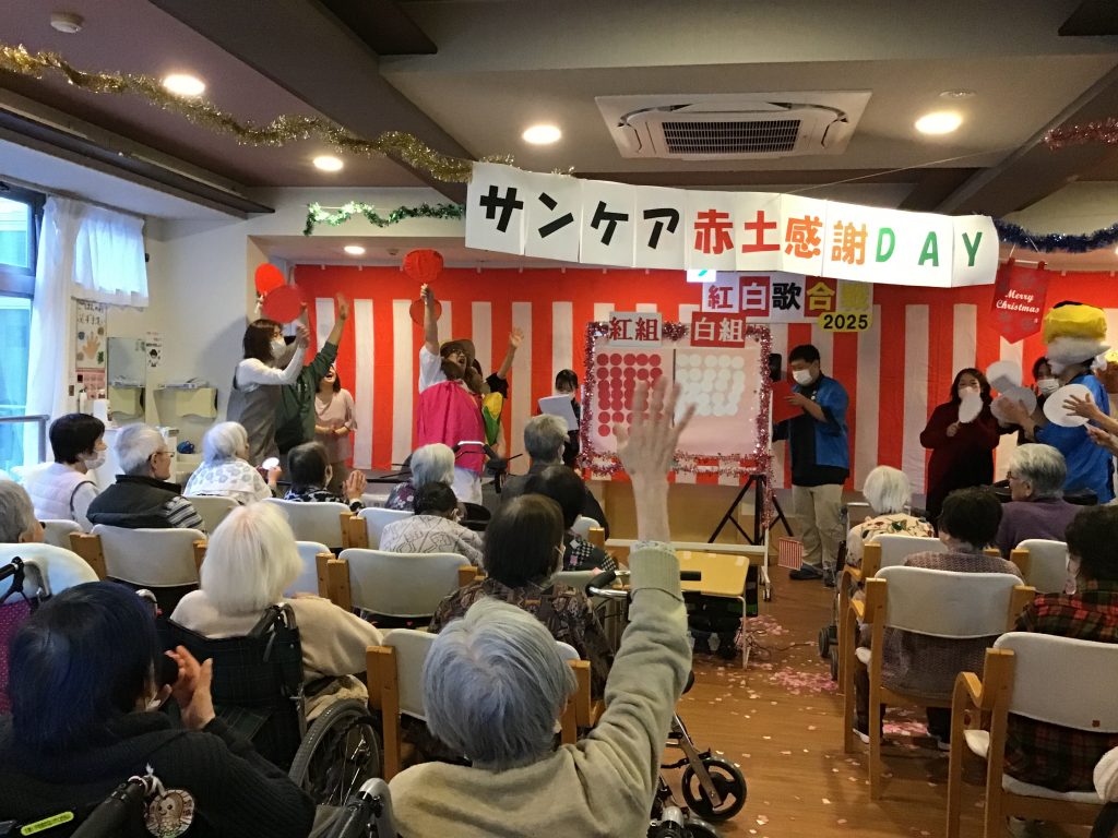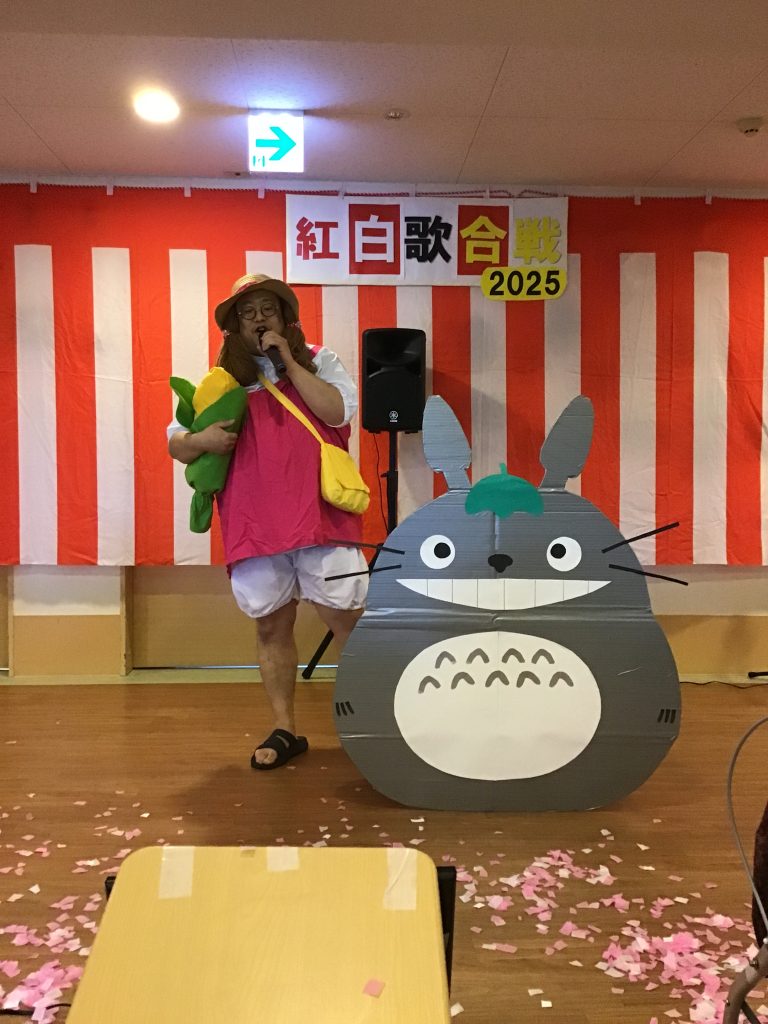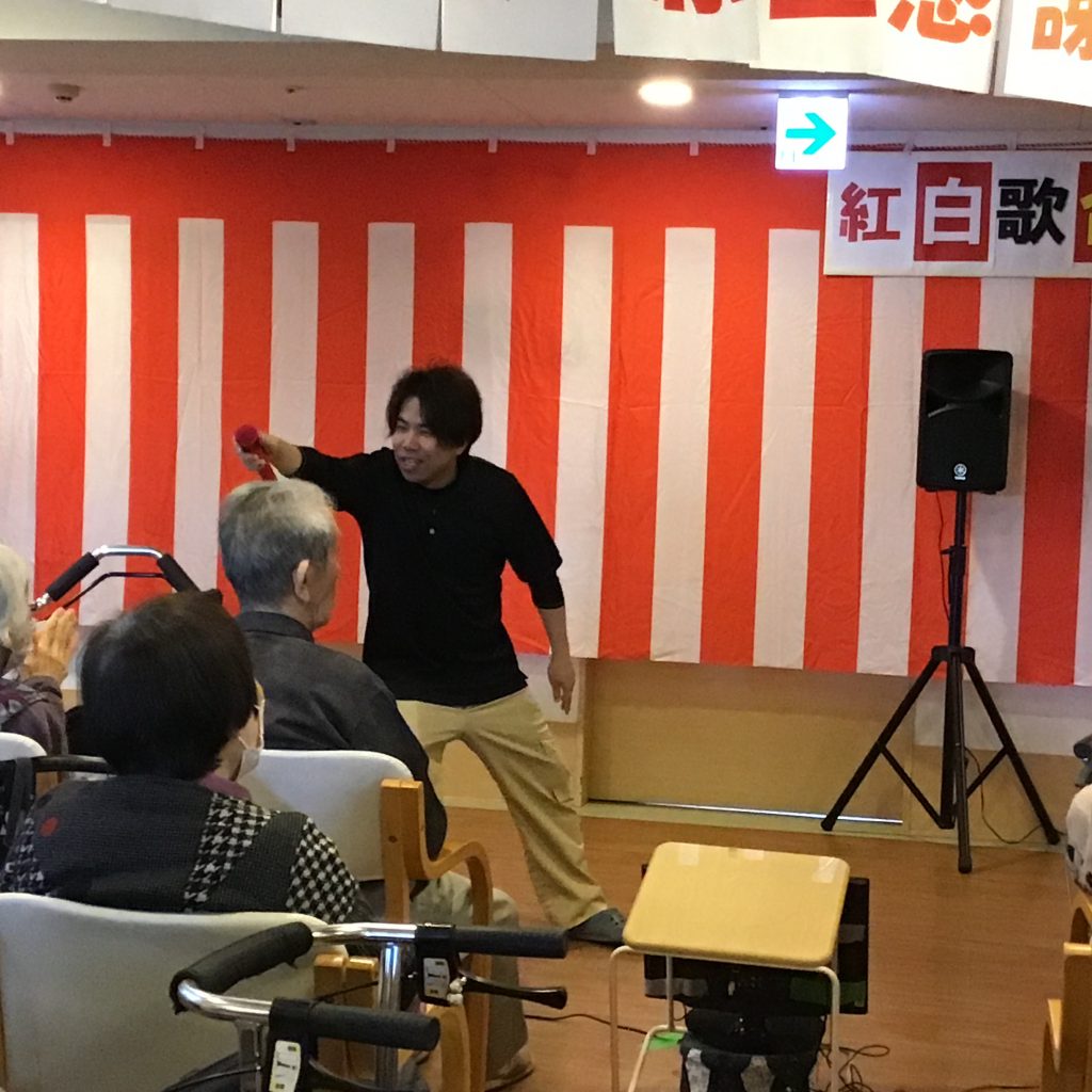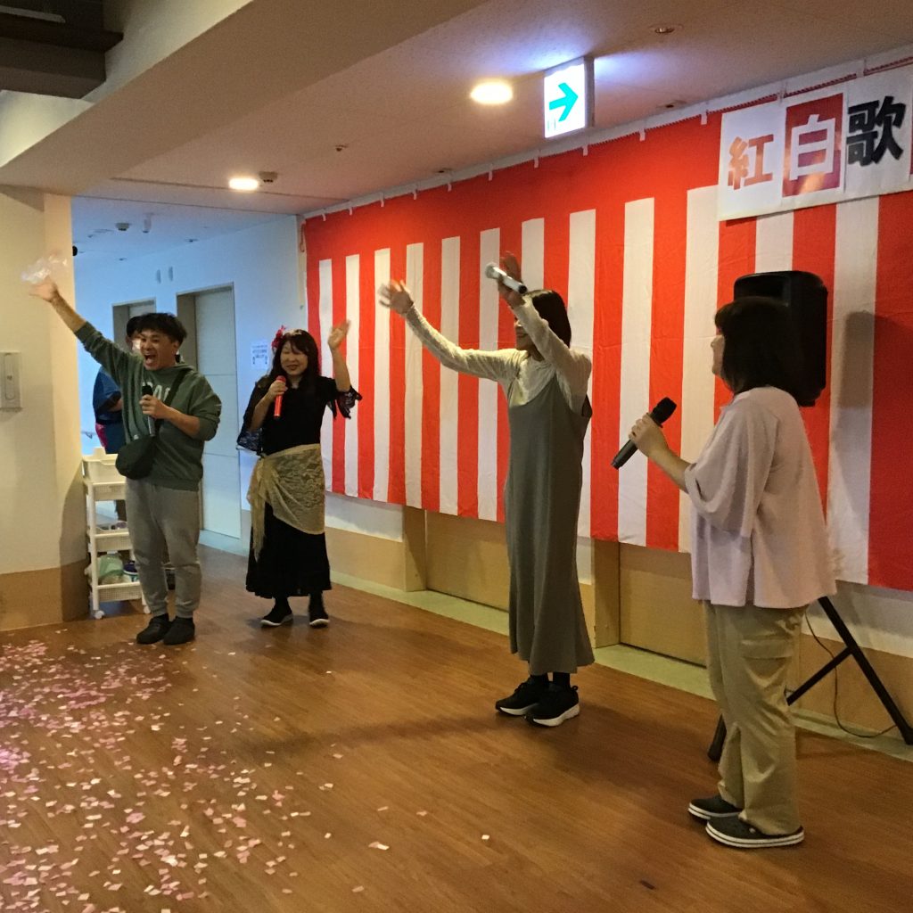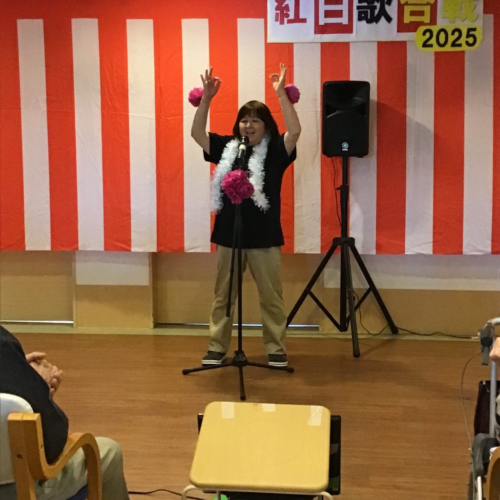 屋台メニューで食事を楽しんでいただき、午後からはちょっと早いですが、紅白歌合戦を行いました。この紅白歌合戦は利用者様が審査員となり、実際に投票していただきました!紅組も白組も気合い入ってます。