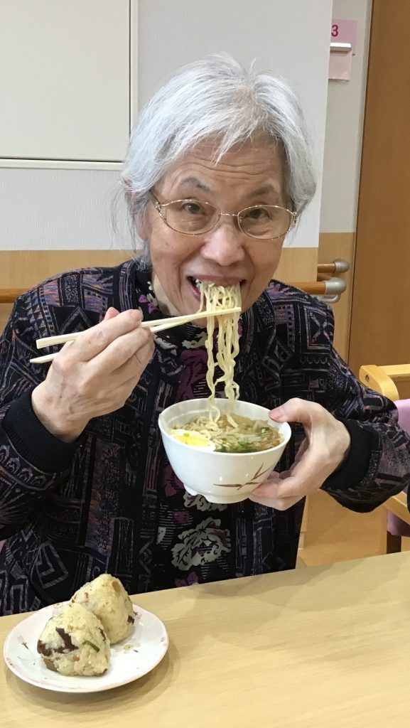 食事レクではラーメンと混ぜご飯のおにぎりを提供しました!