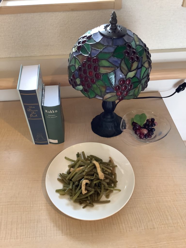 採れたてのさつまいものツルをさっと甘辛く炒めていただきました。