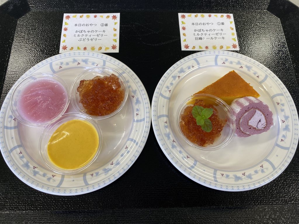 南瓜のケーキ、ミルクティーゼリー、巨峰のロールケーキです。