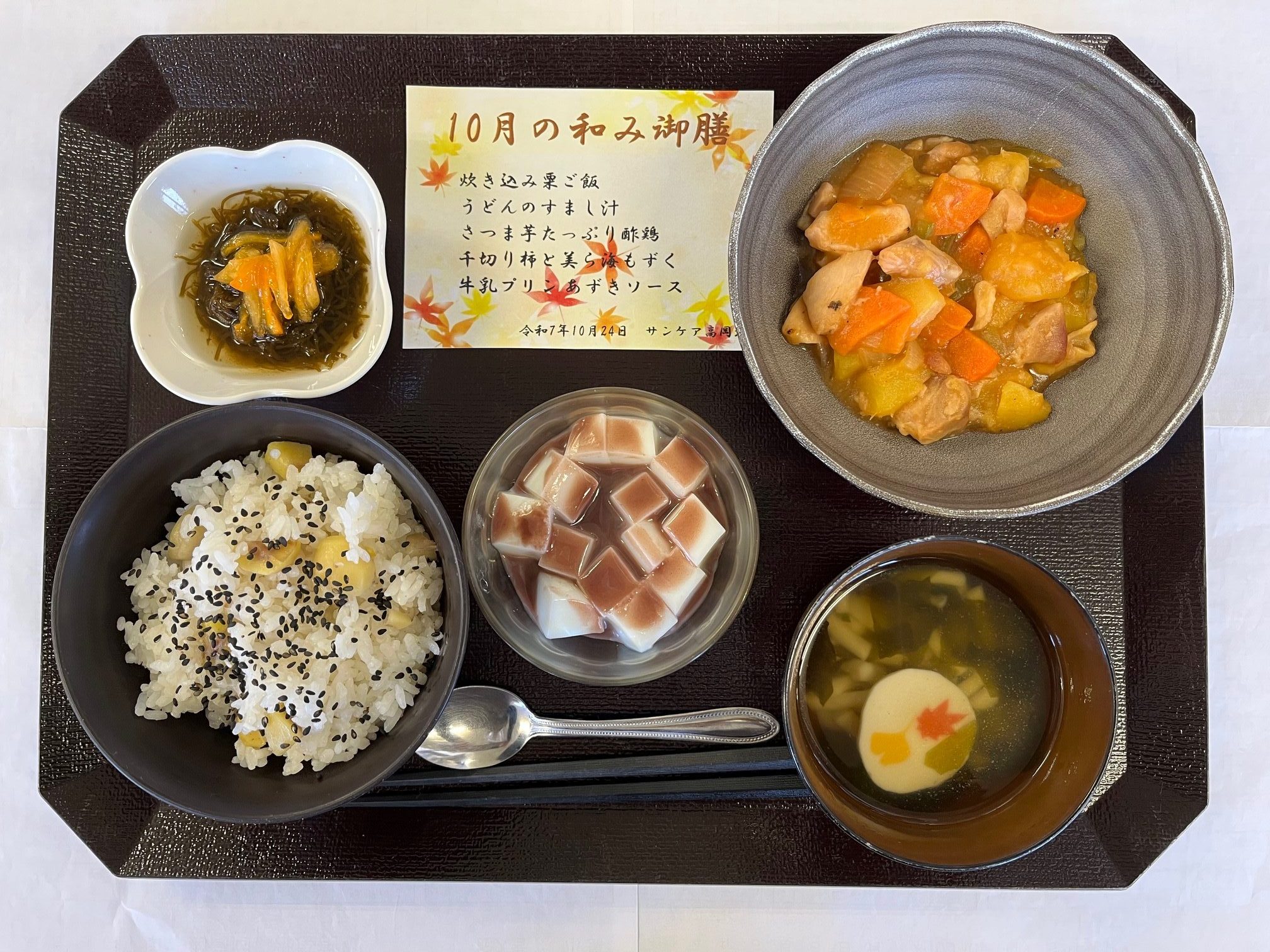 栗ご飯、うどんのすまし汁、さつまいもたっぷり酢鶏、柿と美ら海もずく、