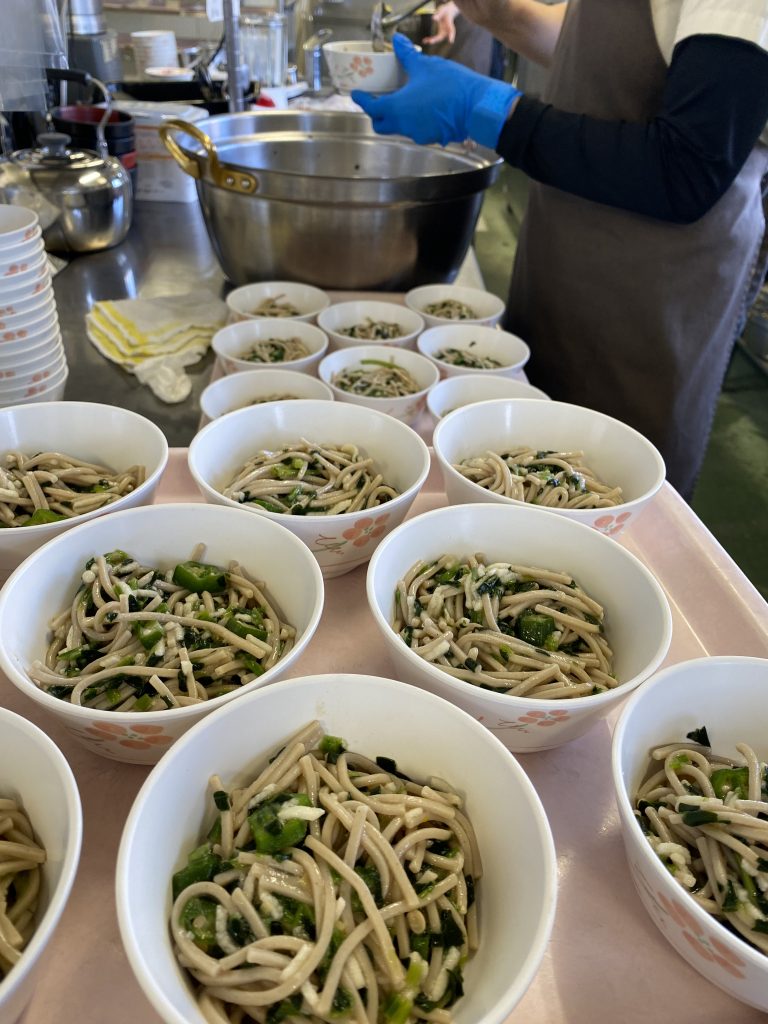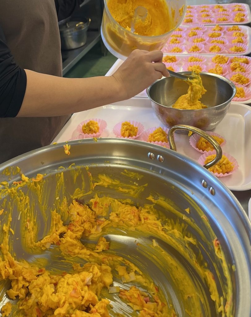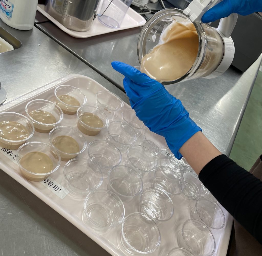 手前の鍋はジョウ菜の南瓜サラダが入っていますが、職員が作業しているのは、フードプロセッサーで細かくしたミジン菜の南瓜サラダです。