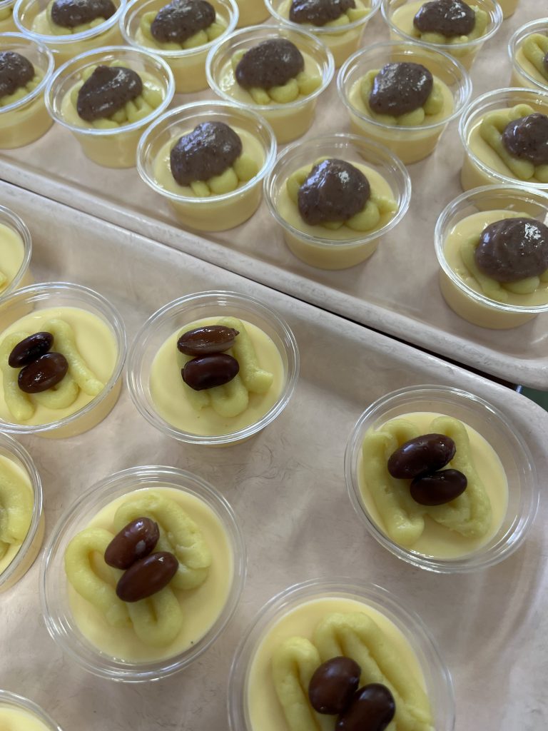 普通のプリンの上にさつま芋ムースを絞り出し、黒豆をのせています。