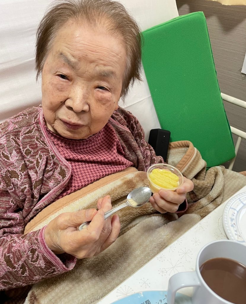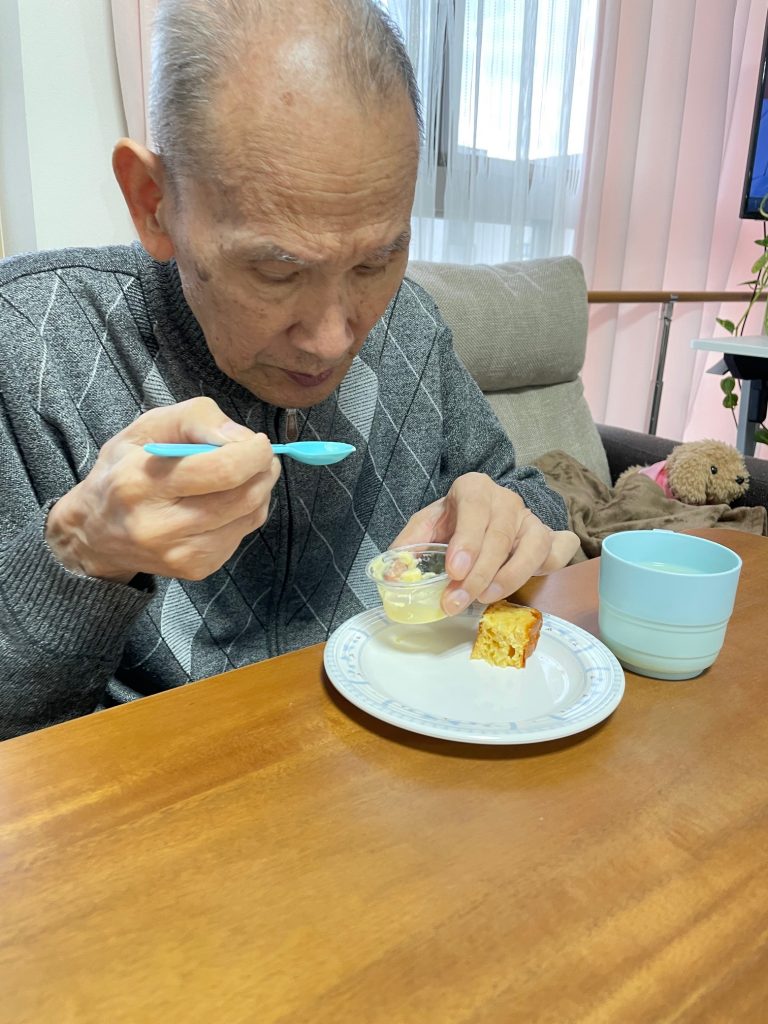 最後に甘いおやつ大好きな、特養に入居されている方のおやつプレートを食べている写真です。