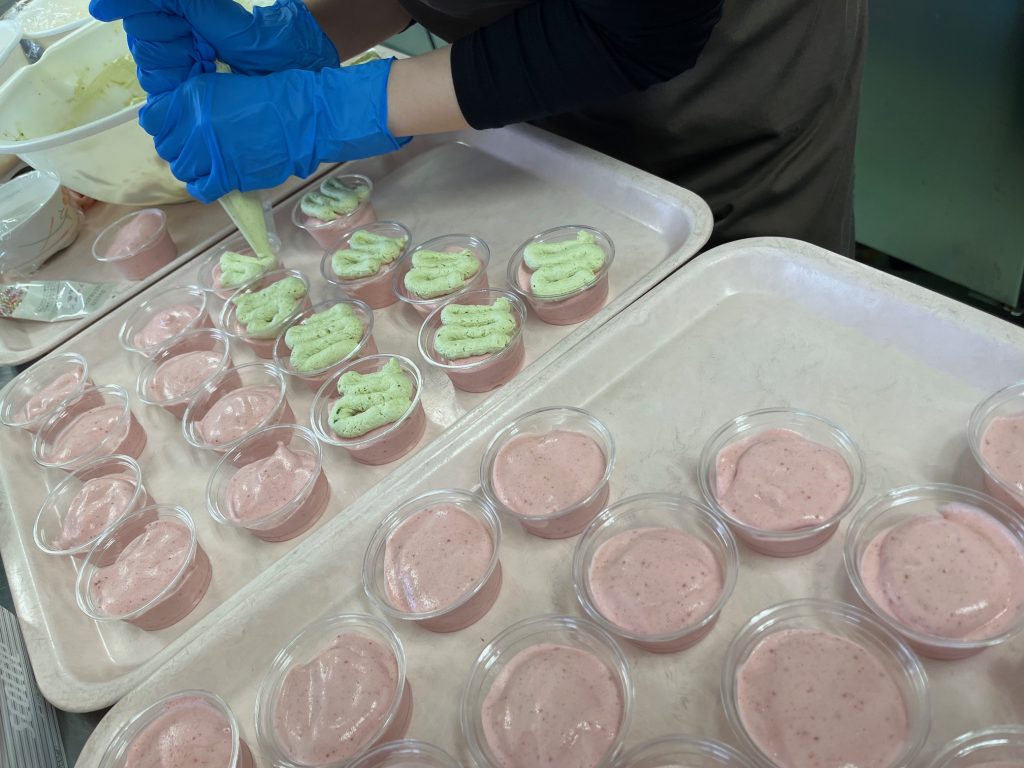 上の写真で作った抹茶ホイップをいちごのムースの上に絞り出しています。