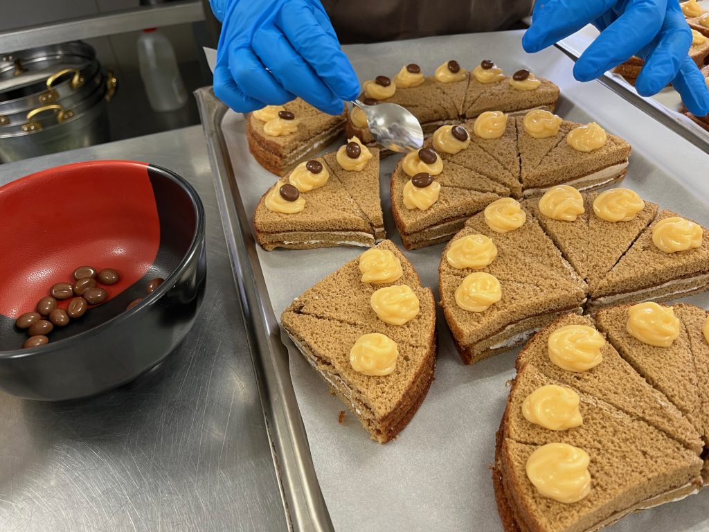 カットしたコーヒースペシャルの上にカスタードクリームとコーヒーチョコを載せています。