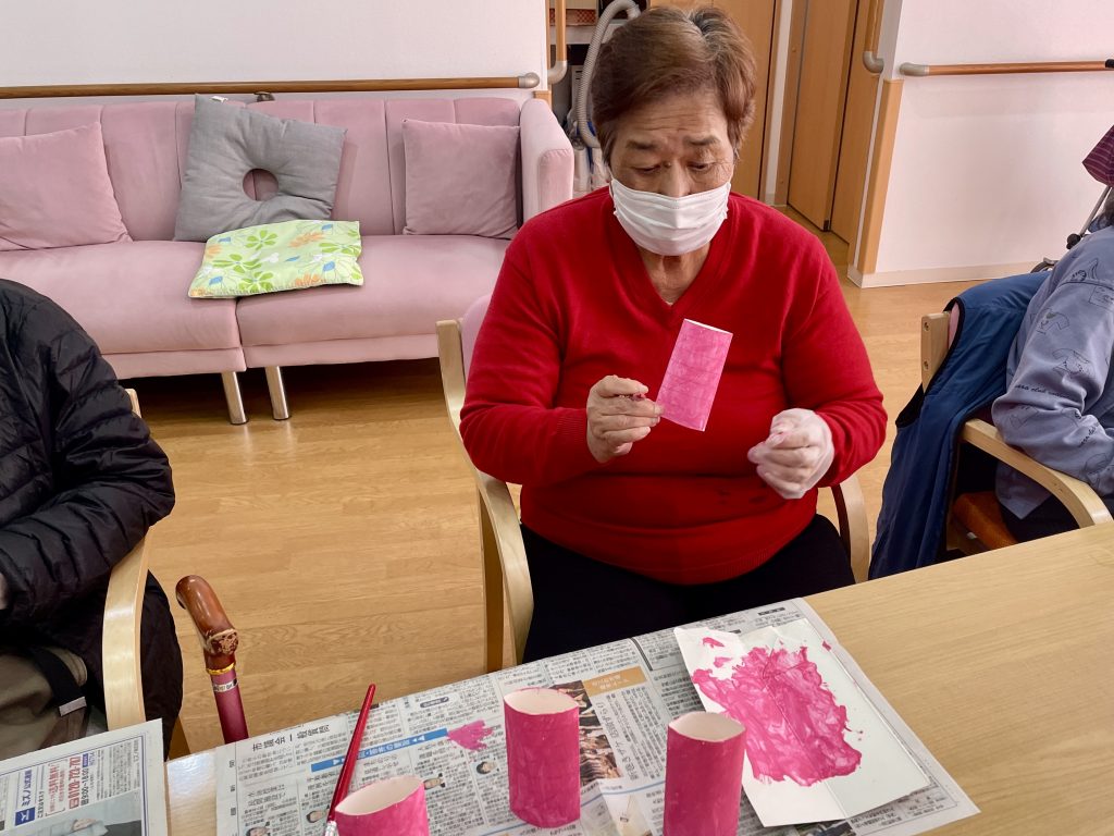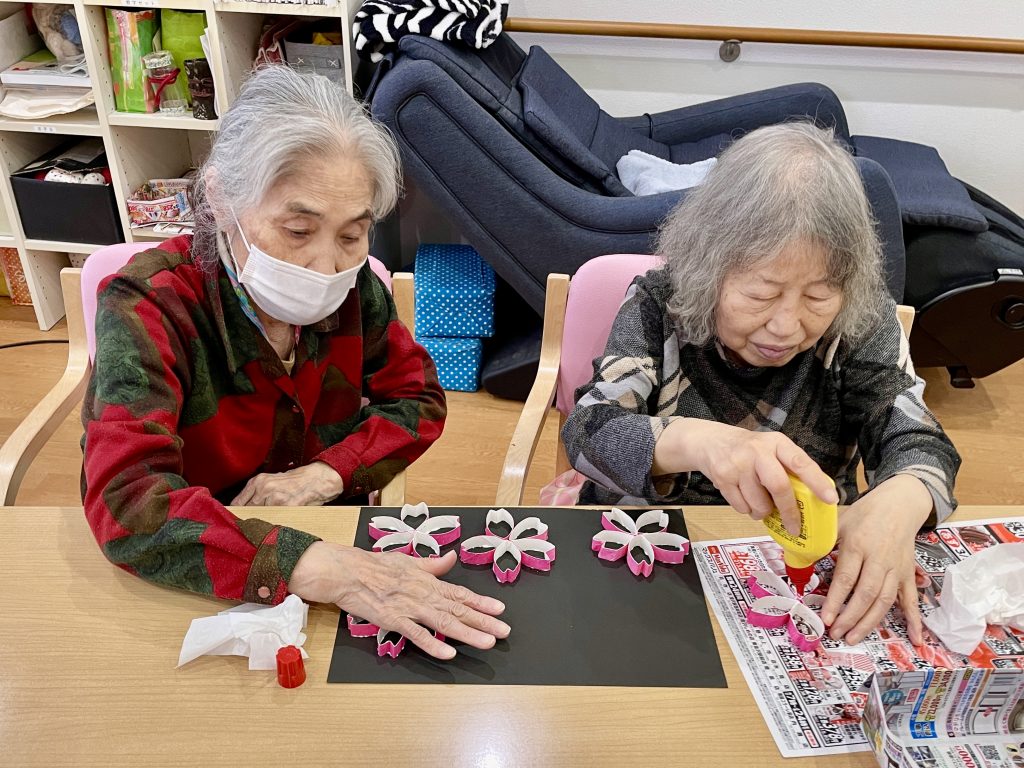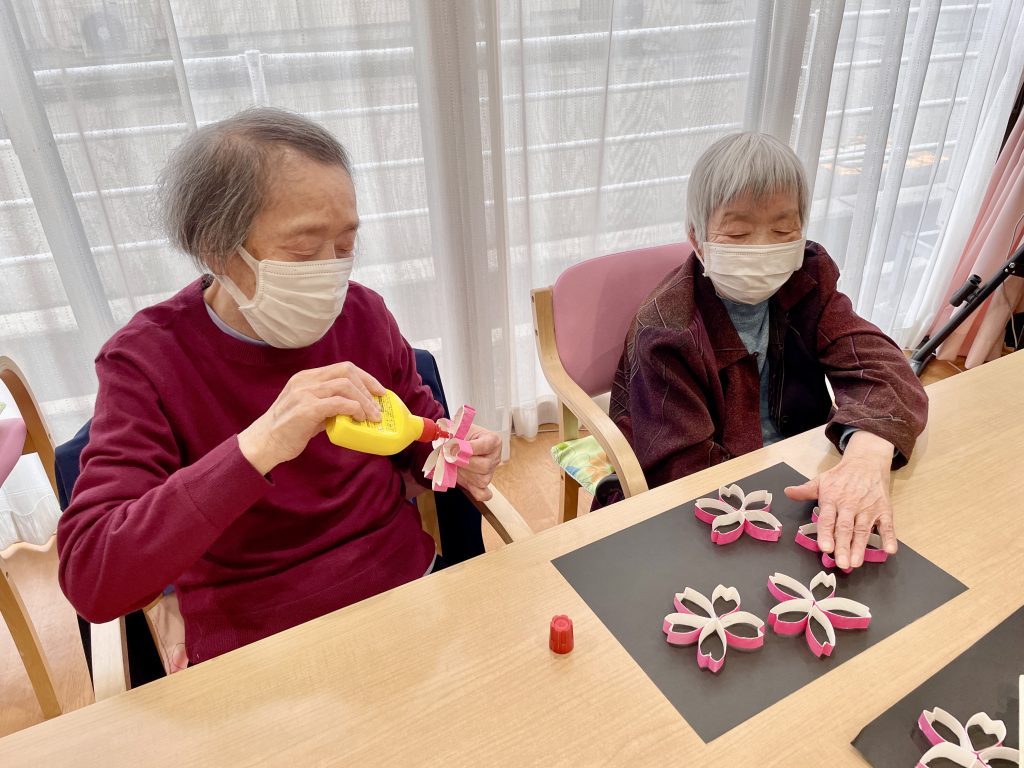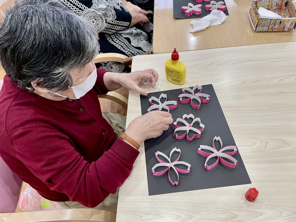 制作レクリエーションではトイレットペーパーの芯を再活用して桜の壁飾りを作りました。皆さんとても真剣に取り組まれ、素敵な壁飾りが完成しました✨